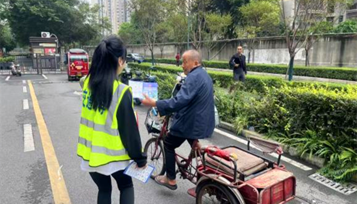 交通安全劝导员并向来往的车辆和行人发放交通安全宣传资料,告知居民出行遵守交通规则,骑行佩戴安全头盔,安全无小事。对过往的行人讲解相关交通安全知识,宣传参与交通,人人有责拒绝不文明行为,让其充分认识到文明出行的重要性,进一步提高群众的交通安全意识。 |