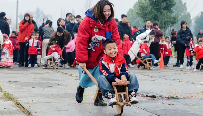 表演结束后,亲子游戏与民俗体验接续登场。鸡公车竞速、箩筐抬福娃等传统游戏,让家长们重温儿时记忆,孩子们则在嬉戏中尽情释放快乐,民俗韵味与童真趣味完美融合。