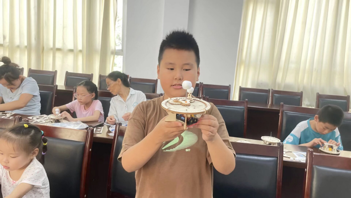 活动中,志愿者老师用趣味语言讲解地球自转与公转、月球轨道及太阳引力等知识,将复杂原理转化为生动比喻,孩子们边学边记,积极互动。随后,大家开始动手搭建模型:拆分木板、组装齿轮,精确调整地球倾斜角度与月球轨道,模拟天体运转。通过反复调试,孩子们成功演示昼夜交替、月相变化等现象,现场充满探索的欢呼声。
