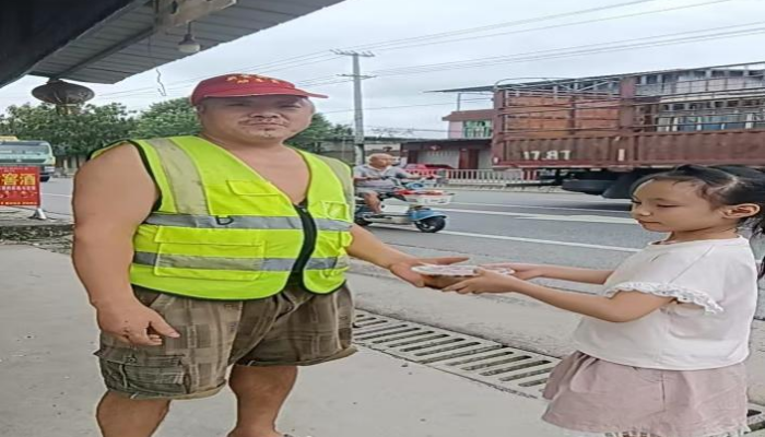 二组志愿者带领小志愿者走到老街口,主动为坚守在道路劝导岗位上的叔叔送上冰粉,小小志愿者双手捧起冰粉,微笑着说:叔叔辛苦了,请您喝一碗冰粉解解暑。劝导员倍感欣慰,他感受到尊重和温暖。 通过活动的开展,让儿童感到从被关怀者转变为“关怀者”,提升沟通能力,增强社会责任感,让儿童学会关爱他人,理解劳动者的价值,让孩子们在实践中长大,成为有用之才。 |