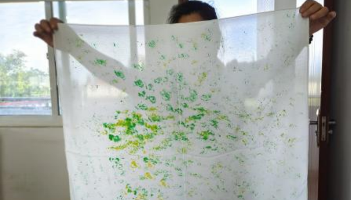 创作环节“印出独属我的丝巾”成为活动高潮。社工为村民们分发包含空白丝巾、颜料、果蔬的材料包,村民们自由分组,充分发挥想象力与创造力。有的以洋葱横截面的环形纹理为基础,融入植物染的对称美感;有的用藕的孔洞纹理模拟棕编的编织纹路;还有的将橙子切片与白菜叶组合,打造出充满生活气息的图案。社工巡回指导,针对拓印力度、色彩搭配等问题提供专业建议,现场氛围热烈而有序。