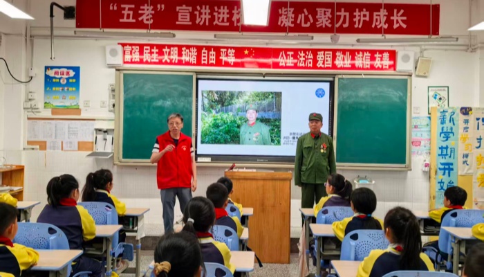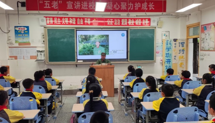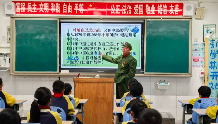 中国西部传统文化网四川讯(特约通讯员 张晶)为强化青少年革命传统与爱国主义教育,推动“五老”宣讲团进校园工作,9月23日,新繁街道关工委赴高宁小学举办“五老”宣讲活动。活动中,退伍老军人曾凡彬老师为同学们讲述了中国对越自卫反击战历史,分享了个人军旅岁月,传承不朽军人精神。