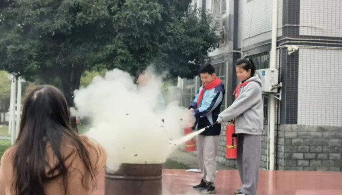 上午9时,警报响起。全体师生用湿毛巾捂住口鼻,弯腰低姿,沿预定路线快速撤离。仅用1分30秒,全校师生就已安全抵达操场。两个校区的老师们分别在现场讲解灭火器“提、拔、握、压”四字使用口诀,语言通俗,演示规范。在模拟火场区域,师生代表和食堂工作人员轮流操作灭火器扑灭火源。实战演练让抽象知识转化为具体技能,大家都受益匪浅。