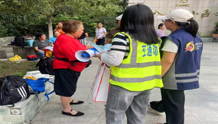 金都街社区交通安全劝导员在主要道路口值守,利用大喇叭循环播放交通安全知识,对行人不走人行道、横穿马路、不按指示灯行走及闯红灯;电瓶车摩托车骑行人员不戴安全头盔,非机动车走机动车道、逆向行驶等行为进行文明劝导。志愿者对金都街社区小区周边道路的乱停乱放等进行劝导,确保道路畅通。