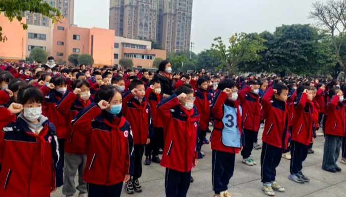 活动伊始,五(6)中队与一(4)班的升旗手们迈着整齐的步伐,护送五星红旗入场。伴随着雄壮的《义勇军进行曲》,五星红旗冉冉升起,全体师生肃立行注目礼,爱国情怀与敬畏之心在每个人心中激荡。
