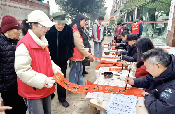 中国西部传统文化网四川讯(特约通讯员 尹华珍)新春将至,年味渐浓。为传承中华优秀传统文化,深化社区居民自治实践,让居民成为社区治理的主角,2026年2月10日,由成都市新都区石板滩街道梁胜社区居民委员会、梁胜社区关工委主办,同心圆社会工作服务中心协办的“我们的节日·春节——笔墨传情润梁胜 春联送福迎新春”主题活动。 在社区党群服务中心与湖心岛小区设点,特邀木兰书画院6位书法老师现场挥毫,社区青少年志愿者全程协助,两百余位居民主动参与、共襄盛举,在墨香氤氲中凝聚自治力量,绘就新春祥和图景。